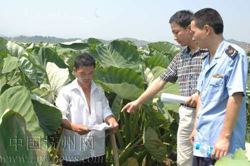近日, 南丰县傅坊乡干部会同县工商局工作人员来到傅坊乡田陀村沙咀村小组计生困难户廖小求家栽种的槟榔芋地里,为他送来了管理槟榔芋的技术。今年,傅坊乡计生办指导他栽种了110亩槟榔芋,从生产资金、芋种购买、管理技术、销售渠道等方面进行帮扶,尽快帮他走上致富路。(袁荣生 黄光明 摄)