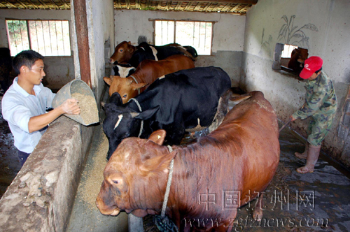 7月23日,南丰县白舍镇苦竹村退伍军人饶水平在为菜牛添加饲料。退伍回乡后,饶水平利用在部队掌握的知识,与当地返乡农民工刘桂发一道创办了一家菜牛饲养场,年收入10多万元。(特约通讯员 黎兴旺 摄)