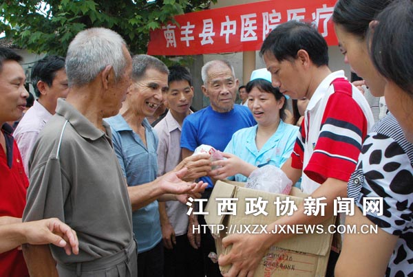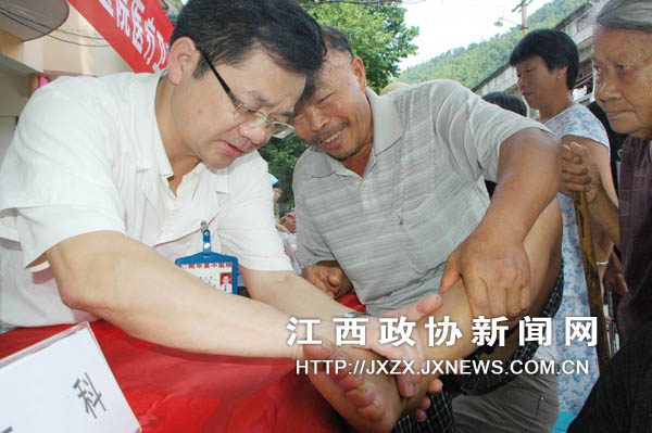 7月29日,江西省南丰县政协委员、中医院主任医师周小平正冒着酷暑在长红垦殖场返乡农民工就业基地为农民工义诊。今年以来,南丰县政协不但积极为返乡农民工创业就业建言献策,而且多次组织医卫界委员、医师深入乡村为返乡农民工送医送药,使他们感受到党和政府的关怀与温暖。