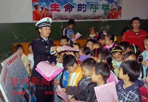 11月11日,南丰县交警大队民警正在该县三溪乡向学生们宣讲“珍爱生命,遵守交通规则”知识,散发宣传资料。当日,该县在三溪乡举行以“生命的呼唤”为主题的交通安全、消防安全图片展首展仪式,教育学生要珍惜生命、热爱生活、遵守交通规则。(特约通讯员 黎兴旺 摄)