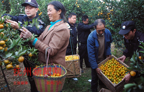 11月22日,南丰县白舍派出所民警利用休息日来到该镇枫江村帮助缺少劳力的桔农采摘蜜桔。目前,正是南丰蜜桔大量采摘时期,针对蜜桔采摘劳力紧缺的情况,白舍派出所组织民警帮助缺少劳力的桔农采收蜜桔。为群众排忧解难,深受群众欢迎。(特约通讯员 黎兴旺 摄)