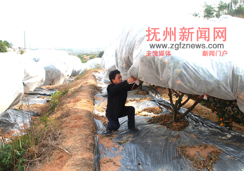 11月30日,南丰县白舍镇望天村村民元才发正在用无纺布给挂果的蜜桔树穿“冬衣”,防止霜冻天气对挂果蜜桔树的影响,可让蜜桔采收期延后40多天。据悉,此种无纺布每棵树投资9元,可重复利用3年,通过延后采收的蜜桔销售价格每公斤可以提高0.4元以上。(付志平 摄)