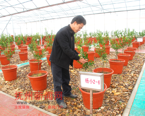 图为近日技术人员在察看蜜桔苗木的长势。(付志平 摄)