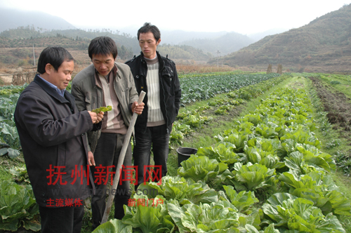 连日来,南丰县组织农技人员深入田间地头,手把手指导农民为农作物御寒保暖,确保果树和蔬菜等农作物安全过冬。图为近日农技人员在傅坊乡董溪村蔬菜种植户邱模华的蔬菜地里传授冬季蔬菜田间管理技术。(袁荣生 陈建明 摄)