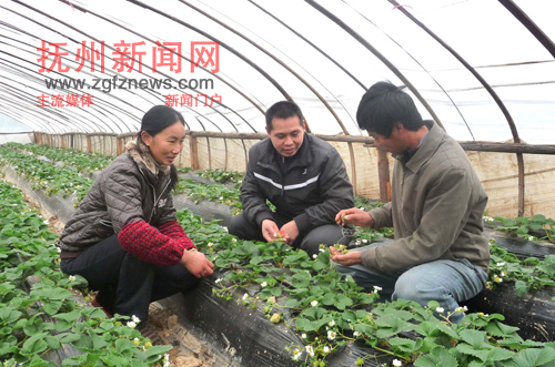 图为该县洽湾镇农技员在给果农传授草莓种植技术