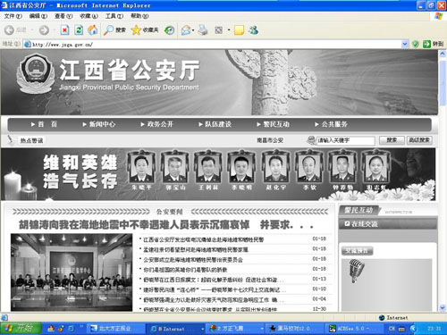 18日,记者登录江西省公安厅主页时发现,为哀悼在海地地震中牺牲的中国维和警察,江西省公安厅的主页已变成黑白色,主页上方挂出了8名牺牲民警的照片,并打出“维和英雄浩气长存”的标语,点击照片可以链接到中国公安部网站的相关专题页面。