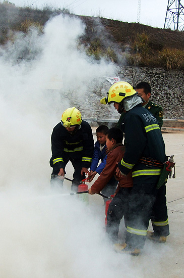 接下来,是学习灭火。消防警官们在教师配合下,组织教师、学生在操场上进行灭火演练。在这个活动阶段,消防警官讲授了灭火器的使用,并让数名教师、学生进行了实际操作。学生们学习兴趣很高,纷纷要求实际操作,活动效果非常好。