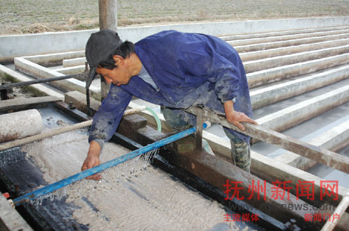 1月25日,南丰县傅坊乡石渠村村民正在利用莲藕根加工藕粉。该村返乡农民工熊平忠利用在外打工时学到的藕粉加工技术,回村创办了藕粉加工厂,年加工藕粉20万公斤,拓宽了村民的增收渠道。(特约通讯员 黎兴旺 摄)