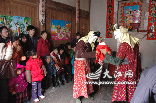 2月18日,江西省南丰县三溪乡石邮村傩班表演傩舞《傩公傩婆》。