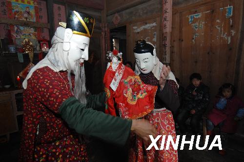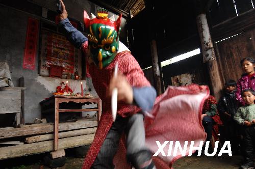 2月27日,江西省南丰县三溪乡石邮村傩班在附近的柏苍村表演傩舞。