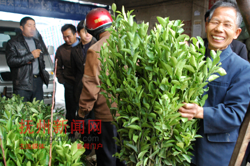 “外出务工不如在家种桔……”3月2日,南丰县桑田镇古城村农民在桔苗市场购买了80株桔苗,乐呵呵地说。眼下正是桔苗种植的最佳时期,由于去年南丰蜜桔销售势头好,许多在外务工的桔农纷纷返乡发展蜜桔种植。(特约通讯员 黎兴旺 摄)
