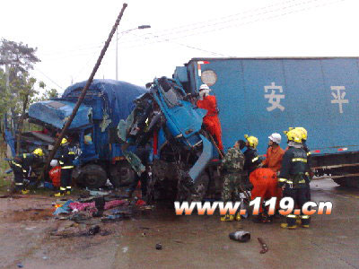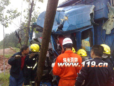 5月16日凌晨4时51分,南丰县消防大队值班室接到报警称:位于昌厦公路与南建公路(南丰—福建建宁)交汇处两辆大货车相撞,两辆货车驾驶员均被困车中,情况非常危急。大队立即出动两辆消防车及14名官兵火速赶往现场救援。