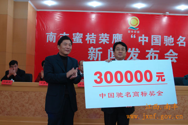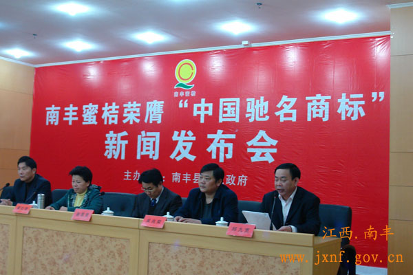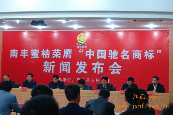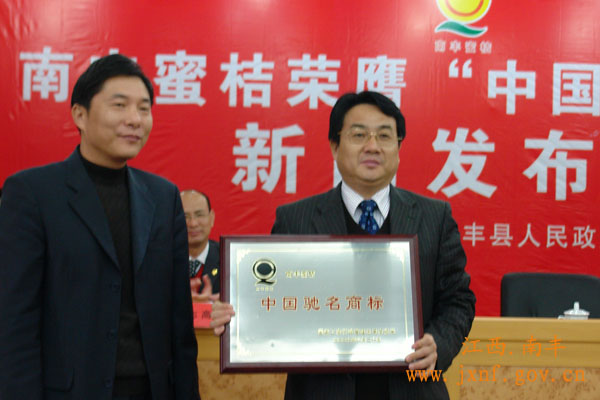 3月12日,省工商局副局长沈庆中,市委常委、副市长黄牡香等有关领导莅临南丰参加南丰蜜桔荣膺“中国驰名商标”新闻发布会。我县获“中国驰名商标”荣誉牌匾1块、奖金30万元。