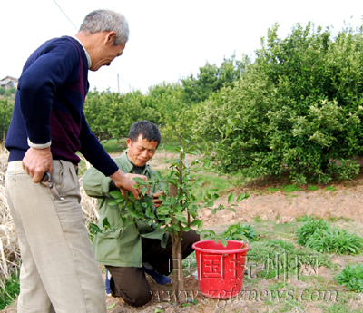 图为琴城镇农技人员正在指导桔农曾水生进行桔树改良嫁接。