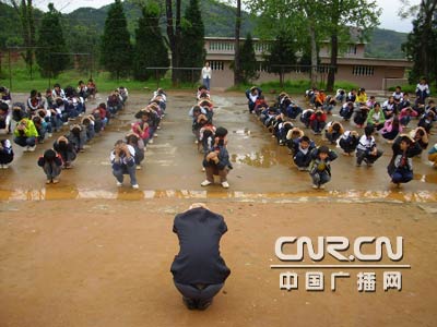 图为 4月16日,南丰县中学高级地理教师赵子绳在太源乡中学对学生进行防雷电知识教育 , 并且为学生做下蹲抱头防雷电示范动作。