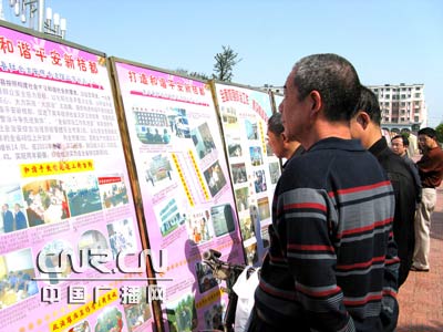 为迎接奥运,铸就和谐平安的环境,自4月24日起,由南丰县政法委牵头,组织公安、交警和乡镇综治办等单位开展综合治理、交通安全宣传图片巡回展,这天在县城展出的20多块图文并茂展板,吸引了众多的群众观看。