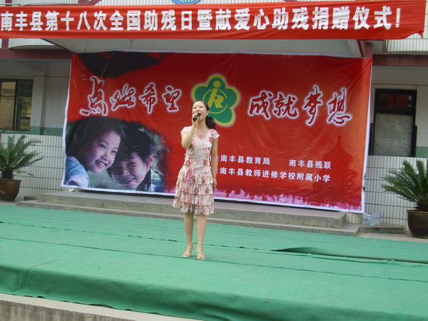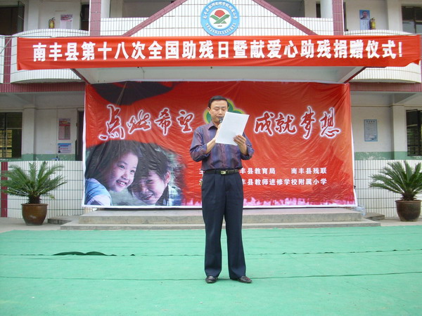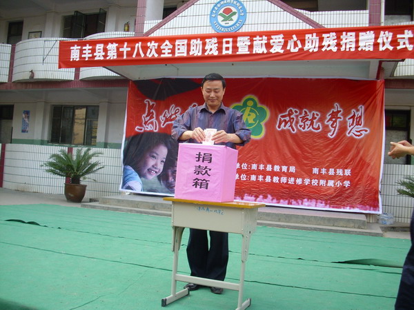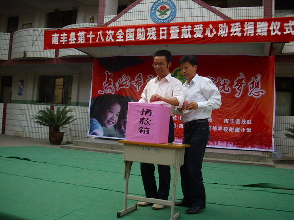 5月12日下午,在县教育局、县残联举办的南丰县第十八次全国助残日暨献爱心助残捐赠仪式上,县政府副县长周金生代表县委、县政府作了热情洋溢的讲话,介绍了县委、县政府对残疾人的关心和帮助,残疾人的生活得到保障,希望全县广大师生积极参与到扶残助残的活动中来,伸出我们爱的双手,为残疾少年儿童奉献自己的一片爱心。也希望残疾少年儿童,要鼓起生活的勇气,树立自强、自立的精神,为实现人生绚丽的梦想而努力奋斗。附小师生还表演了丰富多彩的文艺节目,以教师独唱《爱的奉献》拉开了序幕,学生还表演了舞蹈《中国娃,奥运情》,最后以学生大合唱《感恩的心》结束。