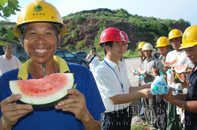 7月3日,南丰供电公司12名抢修人员冒着高温在市山镇罗溪村抢修10千伏输电线路,该公司党支部、工会组织人员将防暑药品、西瓜、矿泉水、毛巾等物品送到抢修人员手中。
