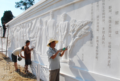 7月4日,南丰县施工人员正在对醒侬公园的汉白玉石雕进行打磨。
