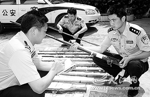 图为7月11日,该局太和派出所民警正在清点查缴的非法枪支。