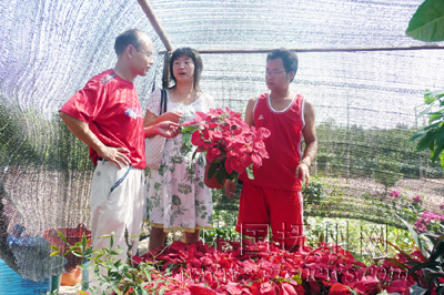 8月13日,南昌客商陈老板来到南丰县市山镇罗溪村村民韩远英的青云园艺场培植基地考察,并当场与韩远英签订了销售合同。韩远英的青云园艺场培植基地占地面积60余亩,培植的一品红、孔雀竹芋、紫薇花在市场上供不应求,年收入近30万元。