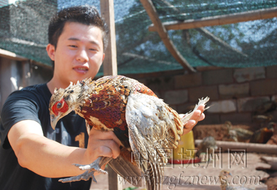 图为市山镇考坑村储家村小组农民曾勇军在他的“野鸡苑”为客户捕捉山鸡