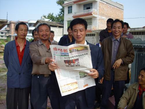 2008年10月14日,在南丰县市山镇梓和村彭家堡村小组,几名村民正在从刚刚收到的《抚州日报》上了解党的十七届三中全会有关内容。他们一边读着报纸,一边高兴地说:“党的十七届三中全会胜利召开,党中央专门研究通过了这么多有利于农村经济发展的决策,我们农民的好日子在后头呢”。