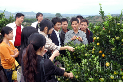 11月4日,南丰县洽湾镇胡家堡村的“土专家”胡国富正在向一群大学生村官传授南丰蜜桔采摘技术。为了进一步了解南丰蜜桔标准化管理以及生产、销售、贮藏情况,更好地为农村经济发展服务,该县大学生村官纷纷向桔农拜师学艺。(俞美华 特约通讯员 黎兴旺 摄)