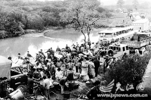 1976年11月,南丰县琴城镇320国道上,农民正在路边的临时集市卖桔子,堵塞了交通(下图)。