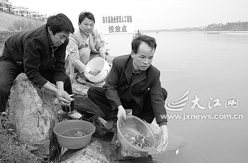 3月27日,南丰县渔政管理人员在渔业资源人工增殖投放点将1.2万尾草、鲢、鳙、鳊、龟、鳖等各类鱼苗投放到河流中,以保护河流的渔业资源和生态环境。