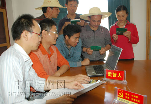 5月23日,南丰县傅坊乡立新村农民正在该乡财政所“便民服务台”查询“家电下乡补贴”“一卡通”发放情况。傅坊乡以深入学习科学发展观为契机,全面推进机关效能建设,设立了方便农民群众查询各项惠农补贴“一卡通”发放情况查询服务台,聘请了乡人大代表、纪检监察干部全方面监督,确保各项惠农补贴及时、准确发放到每位农民手中。