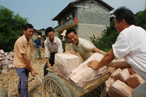 6月23日,南丰县洽湾镇上店村的党员服务队来到徐家村帮忙修建乡村公路。今年以来,南丰县以开展深入学习实践科学发展观活动为契机,在农村党员中广泛开展“为党旗增辉,党员形象耀山村”活动,进一步增强农村党员奉献社会、服务群众的意识。