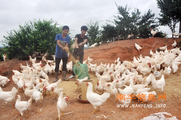 9月6日,南丰县桑田镇荷田村谭家村小组养鸡大户谭必光正在用稻谷喂养土鸡。从2013年开始,农民谭必光承包150亩荒山丘陵种植橘树,利用橘树林草坡资源丰富,依山傍水,得天独厚的生态条件放养土鸡1600羽,土鸡觅食虫草和少量谷物、在林间飞跃,不但降低了养殖成本,而且节约了土地,鸡肉、鸡蛋比一般鸡更鲜美,被当地人称为“山鸡”,目前,谭必光年出售成鸡1300羽,土鸡蛋5万枚,年收益达20万元,成为当地依靠生态养殖,节地增收,脱贫致富的典型。(黎兴旺)