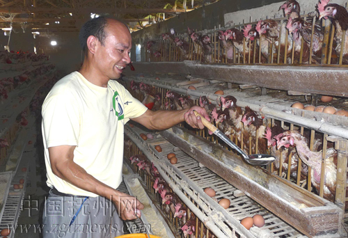 图为李华平正在养鸡场喂饲料