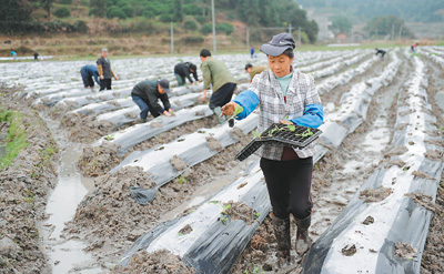 3月20日,江西南丰县傅坊乡荷塘村农民在一起春耕劳作。为抢抓农时,及时将春季农作物栽种下去,许多农民自由组建“春耕互帮互助组”,一起共同完成培土、铺膜、栽种等各项春耕生产活动。(周科摄)