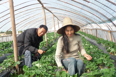 图为江兰仔夫妇在采摘草莓