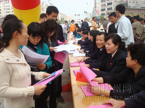 为深入贯彻落实科学发展观,近日,南丰县政法委紧紧围绕“保增长、保民生、保稳定”的总体要求,在县城中兴广场举办“综治集中宣传日”活动,共发放宣传资料6000余份,接受群众咨询100余人(次)。图为群众在向法院工作人员咨询法律知识。