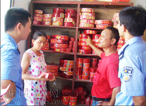 近日,南丰县公安局、安监局、县综治办联合组织安全检查组深入各乡镇,开展烟花爆竹安全管理检查活动。工作人员通过散发宣传资料、设立咨询台等方式,向群众讲解夏季安全知识,并对烟花爆竹生产经营场所进行了检查。图为工作人员在白舍镇集贸市场开展检查。